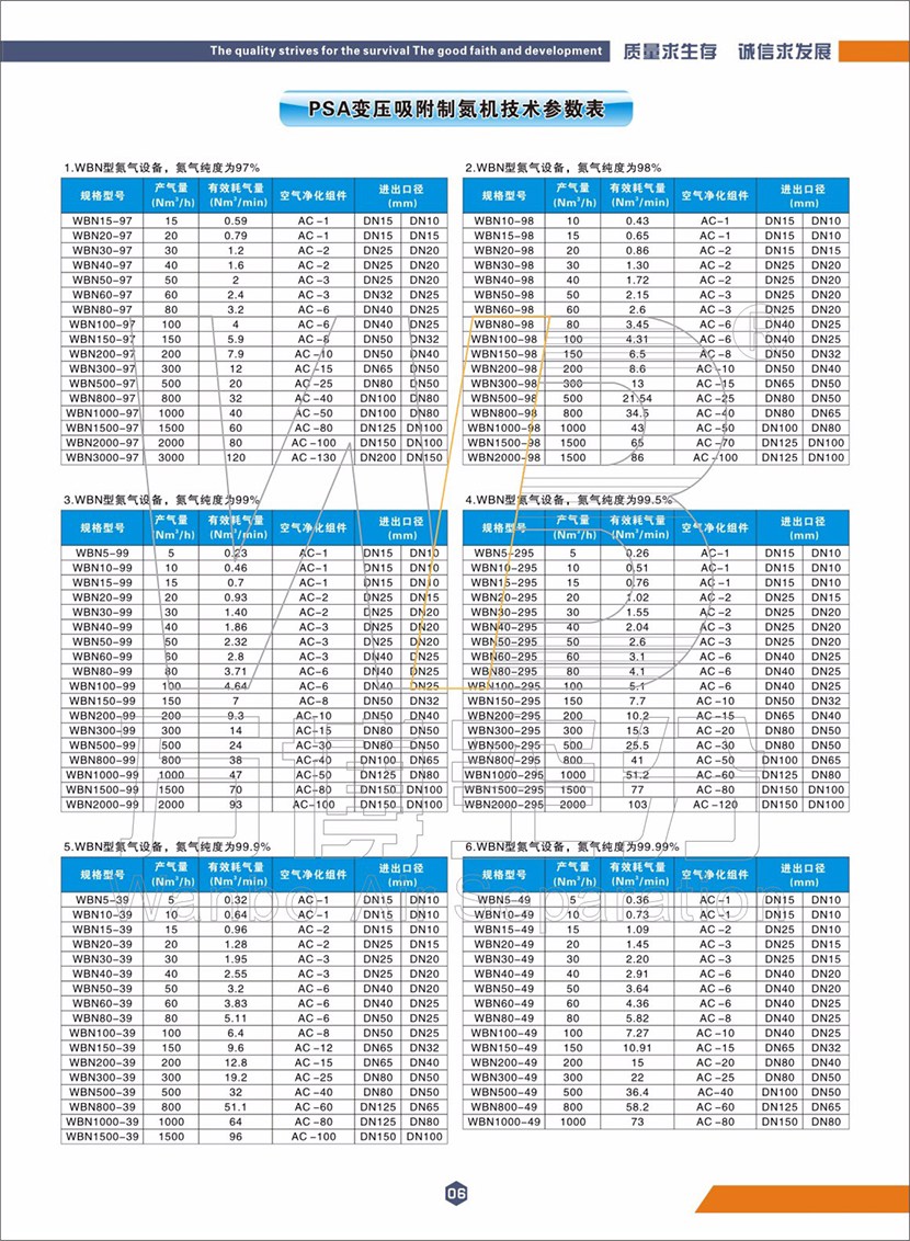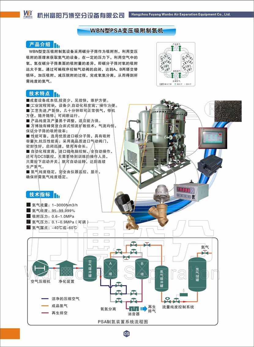 WBN系列变压吸附制氮机设备根据氮气纯度可分为八种型号,即:WBN97、WBN98、WBN99、WBN295、WBN39、WBN49、WBN59、WBN595。